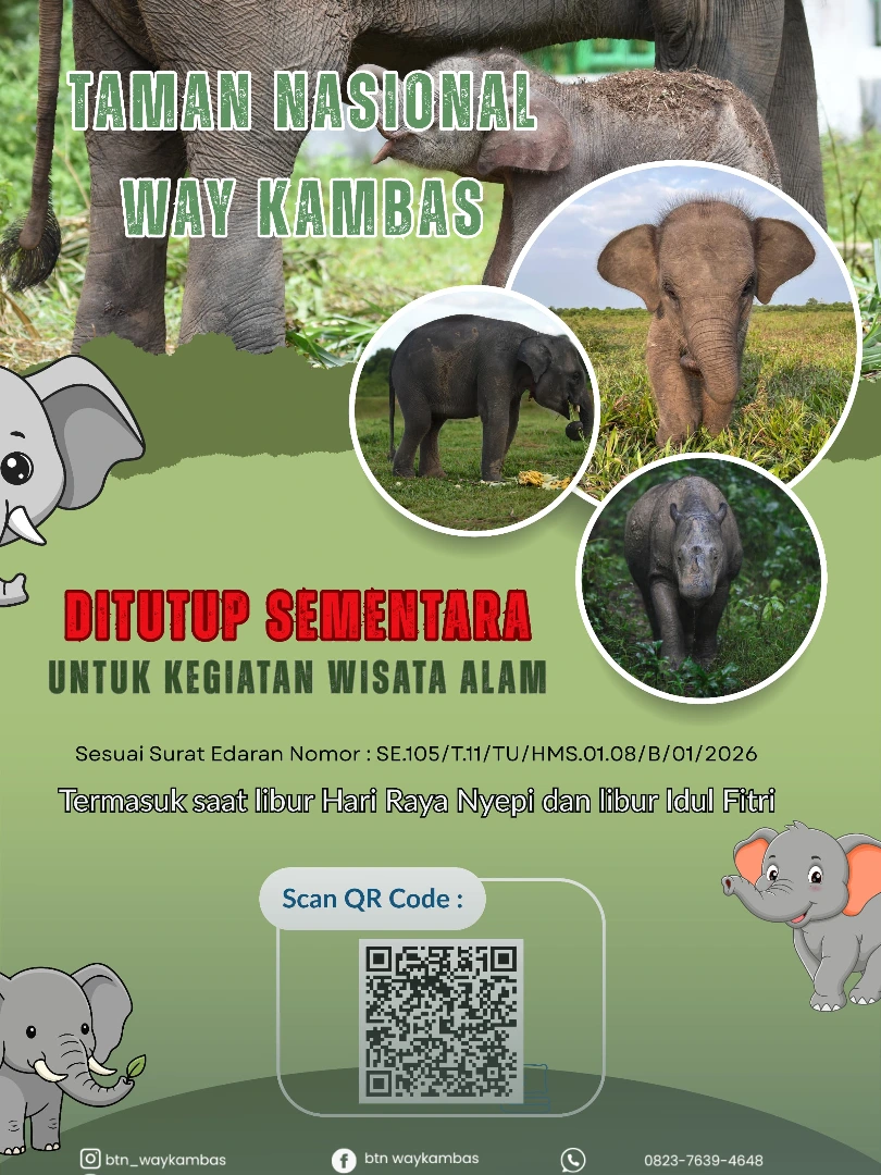 Balai Taman Nasional Way Kambas (TNWK) menyampaikan informasi penting bagi seluruh masyarakat dan calon pengunjung wisata alam. Berdasarkan Surat Edaran Nomor: SE.105/T.11/TU/HMS.01.08/B/01/2026, kegiatan wisata alam di kawasan TNWK saat ini dinyatakan ditutup untuk sementara waktu. Penutupan ini mencakup seluruh operasional kunjungan, termasuk pada periode libur Hari Raya Nyepi dan libur Hari Raya Idul Fitri mendatang.